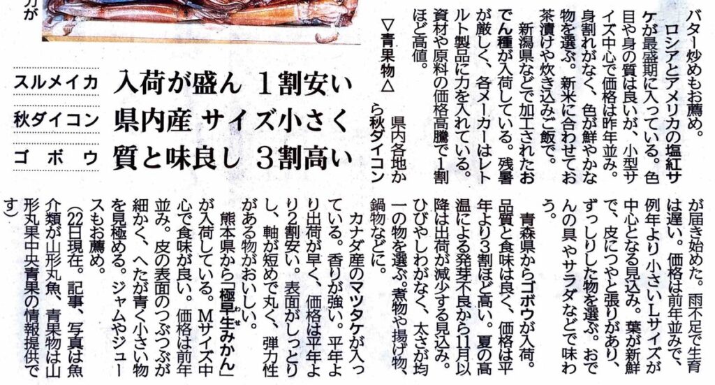 市場情報 11月1日掲載分 山形新聞 山形市公設卸売市場 市場情報 『山形新聞』2023.11.1 朝刊 市場情報より青果物 抜粋 ▼山形新聞は、山形県内をはじめ、国内外の政治、経済、社会、スポーツなど最新の...