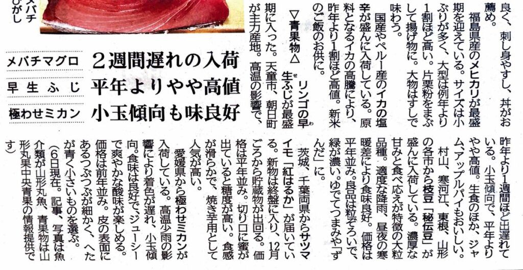 市場情報 1月8日掲載分 山形新聞 山形市公設卸売市場 市場情報 『山形新聞』2025.1.8 朝刊 市場情報より青果物 抜粋 ▼山形新聞は、山形県内をはじめ、国内外の政治、経済、社会、スポーツなど最新のニ...