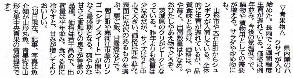 市場情報 7月20日掲載分 山形新聞 山形市公設卸売市場 市場情報 『山形新聞』2022.7.20 朝刊 市場情報より青果物 抜粋 ▼山形新聞は、山形県内をはじめ、国内外の政治、経済、社会、スポーツなど最新の...
