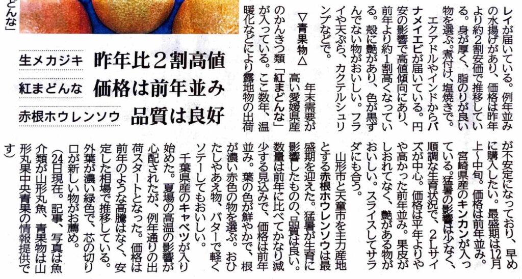 市場情報 11月23日掲載分 山形新聞 山形市公設卸売市場 市場情報 『山形新聞』2022.11.23 朝刊 市場情報より青果物 抜粋 ▼山形新聞は、山形県内をはじめ、国内外の政治、経済、社会、スポーツなど最新...