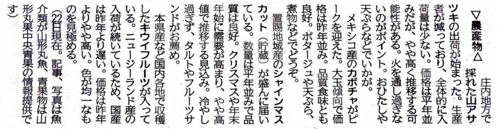 市場情報 12月27日掲載分 山形新聞 山形市公設卸売市場 市場情報 『山形新聞』2023.12.27 朝刊 市場情報より青果物 抜粋 ▼山形新聞は、山形県内をはじめ、国内外の政治、経済、社会、スポーツなど最新...