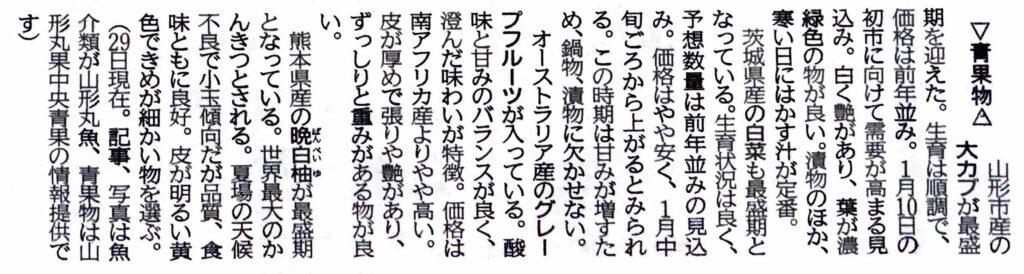 市場情報 pickup 12月31日掲載分 山形新聞 山形市公設卸売市場 市場情報 2025年12月31日 ▼山形新聞は、山形県内をはじめ、国内外の政治、経済、社会、スポーツなど最新のニュースをいち早くお届けします。 https://www.yamagata-np.jp/ Twitter