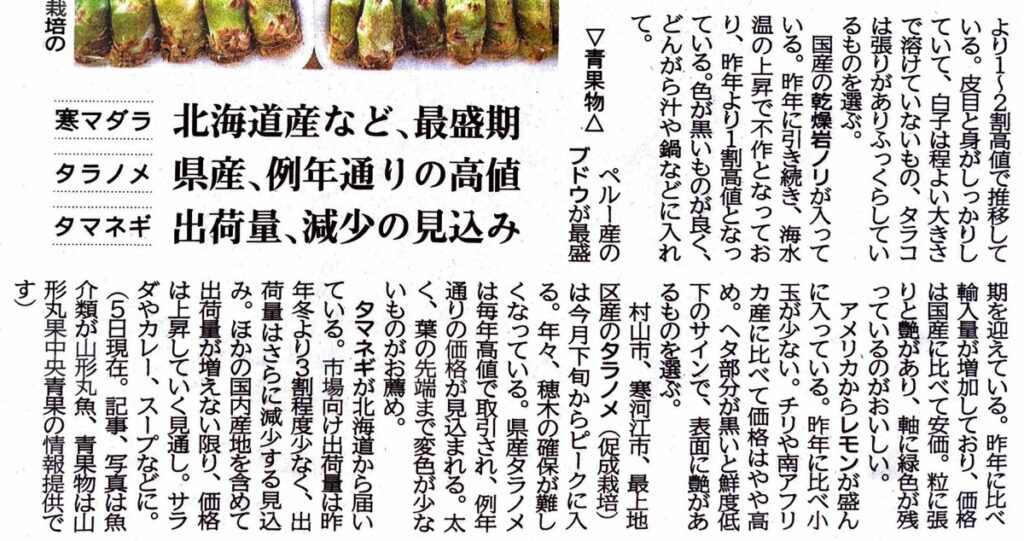 市場情報 12月20日掲載分 山形新聞 山形市公設卸売市場 市場情報 『山形新聞』2023.12.20 朝刊 市場情報より青果物 抜粋 ▼山形新聞は、山形県内をはじめ、国内外の政治、経済、社会、スポーツなど最新...