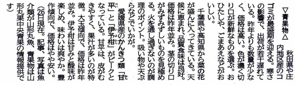 市場情報 7月10日掲載分 山形新聞 山形市公設卸売市場 市場情報 『山形新聞』2024.7.10 朝刊 市場情報より青果物 抜粋 ▼山形新聞は、山形県内をはじめ、国内外の政治、経済、社会、スポーツなど最新の...