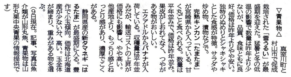 市場情報 5月31日掲載分 山形新聞 山形市公設卸売市場 市場情報 『山形新聞』2023.5.31 朝刊 市場情報より青果物 抜粋 ▼山形新聞は、山形県内をはじめ、国内外の政治、経済、社会、スポーツなど最新の...