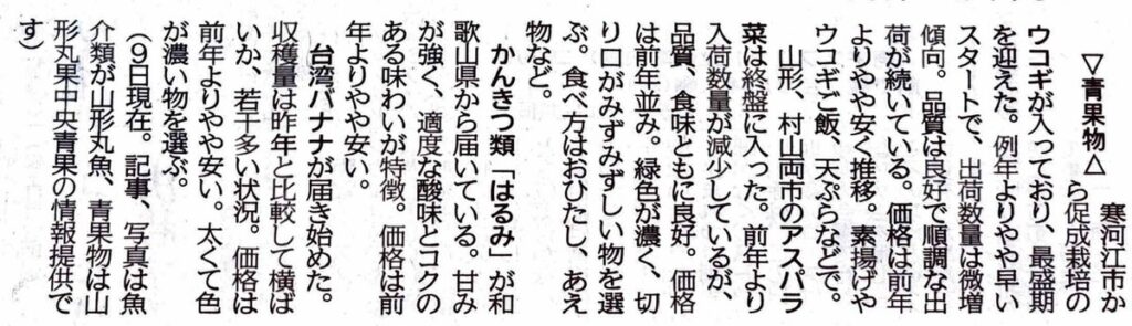 市場情報 4月12日掲載分 山形新聞 山形市公設卸売市場 市場情報 『山形新聞』2023.4.12 朝刊 市場情報より青果物 抜粋 ▼山形新聞は、山形県内をはじめ、国内外の政治、経済、社会、スポーツなど最新の...